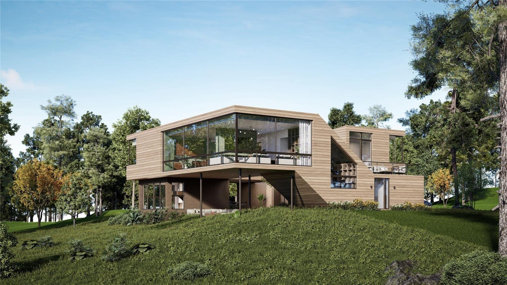 "Lift House," a soon-to-be-built residence, embodies modernism in its purest form, blending natural elements with contemporary design in perfect harmony. Set on 14 acres, the home appears to rise from the earth itself, its elevated floor plan enhancing its connection to the landscape. Warm Accoya wood siding spirals around the structure, supported by two muted burgundy brick volumes and framed by a grid of bronze columns. These natural hues seamlessly integrate with the land, while also standing apart, creating a dynamic dialogue between the home and its environment. A serene koi pond reflects both the site’s colors and the architecture’s striking forms. The entry experience is carefully choreographed: a meandering pathway through a garden courtyard leads to a dramatic hardwood pivot door, welcoming guests into the home. Inside, open spaces, clean lines, and a restrained material palette create an effortless flow. The great room, the heart of the home, features soaring ceilings and expansive glazing that flood the space with natural light. A stone-clad fireplace anchors the room, subtly dividing it from the kitchen and dining areas. The gourmet kitchen is a study in contemporary elegance, with walnut and lacquered cabinetry, top-of-the-line appliances, and a grand marble island. The dining area, framed by sweeping views of the grounds, offers an ideal setting for both intimate meals and large gatherings. The home includes four spacious bedrooms and four and a half bathrooms, including a primary suite with a spa-like bath, custom walk-in closet, and a private terrace bathed in southern light. On the mezzanine level, with southern exposure and sweeping views, the home office provides a quiet, private workspace. The lower lounge area opens to both covered and open patios designed for cooking, dining, and relaxation. An in-ground pool can be added to complete the space, and the lounge can be converted into an attached pool house with a wet bar and full bath. Sustainability is seamlessly integrated into the design, with triple-pane windows, extensive insulation, and energy-efficient systems throughout. The home incorporates passive solar strategies and eco-conscious materials, ensuring that luxury and nature coexist in perfect balance.