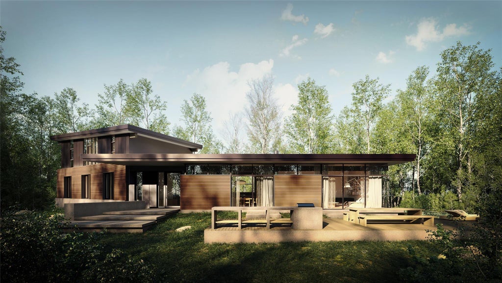 At the end of a bucolic country road, up a long driveway and perched atop a forested rise sits Honeycomb, one of four custom designed homes to be built at Beehive, a private and secluded four home enclave in Accord. Inspired by mid-century modern masterpieces, the design invokes simplicity in nature with light and air prioritized to seamlessly co-exist with the natural surroundings. The architecture is defined by a distinctive flat roof, reaching out into the landscape. Two asymmetric wings are offset to strategically capture natural light. The single level communal wing includes a chef's kitchen, a double-sided fireplace and an outdoor screened in porch. A two-level sleeping wing contains two bedrooms on the ground floor and a primary ensuite and flex space on the second floor. An expansive deck outfitted with an all-season kitchen and comfortable dining/lounge area, a screened-in room porch, a stargazing terrace and trails into the forest promote a robust outdoor life.