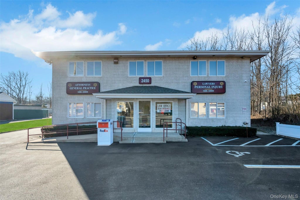 Opportunity Knocks. Prime prime location on Middle Country Rd in the heart of Centereach. 2nd floor office space currently being used as a lawyers office for the past 20+ years. Approx 2500 sq ft. 5 separate private offices including one with a private bathroom. 3 bathrooms in total, including 1 Handicap Accessible. Large conference room. Secretarial pool desks plus private reception area. Stair lifts already in place for Handicap access and functionality. Space is completely furnished right down to computers, phones and office equipment. Kitchen area and abundant storage. For the right tenant, entire building may be available for lease. Available February 15th, 2025. Tenant responsible for utilities.