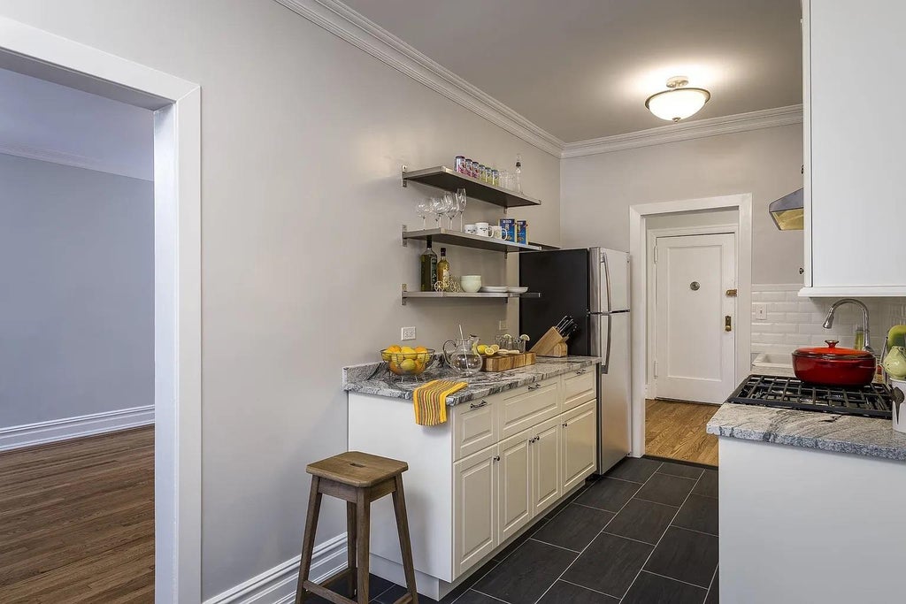Step into elegance with this charming 1-bedroom, 1-bath residence, perched on the 5th floor of a distinguished elevator building in the vibrant, historic neighborhood of Jackson Heights. Spanning approximately 900 square feet, this apartment is bathed in natural light and features 9-foot ceilings showcasing luxurious, timeless details. The eat-in kitchen boasts brand-new stainless steel appliances, including a gas range with convection oven, a vented range hood, and a quiet, energy-efficient dishwasher. High-end granite countertops and Italian ceramic floor tiles bring an added touch of sophistication. Throughout the rest of the unit, you'll be captivated by the beautifully restored original oak floors adorned with mahogany inlay borders, decorative molding, and artisan-crafted trim-work. The fully renovated bathroom features classic subway tiles, a sleek white ceramic pedestal sink, and a bathtub-and-shower combination with elegant Carrara marble corner shelves. A small ventilated window with a Carrara marble sill enhances the space, while a tall medicine cabinet with dual mirrored doors and integrated LED lighting offers both style and function. The floor is adorned with striking black-and-white porcelain tiles arranged in a basketweave pattern. Convenient building amenities include laundry facilities, and the apartment is well-connected with nearby E, F, M, R, and #7 trains, offering easy access to all five boroughs and the Long Island Rail Road (LIRR). *Some photos are virtually staged.