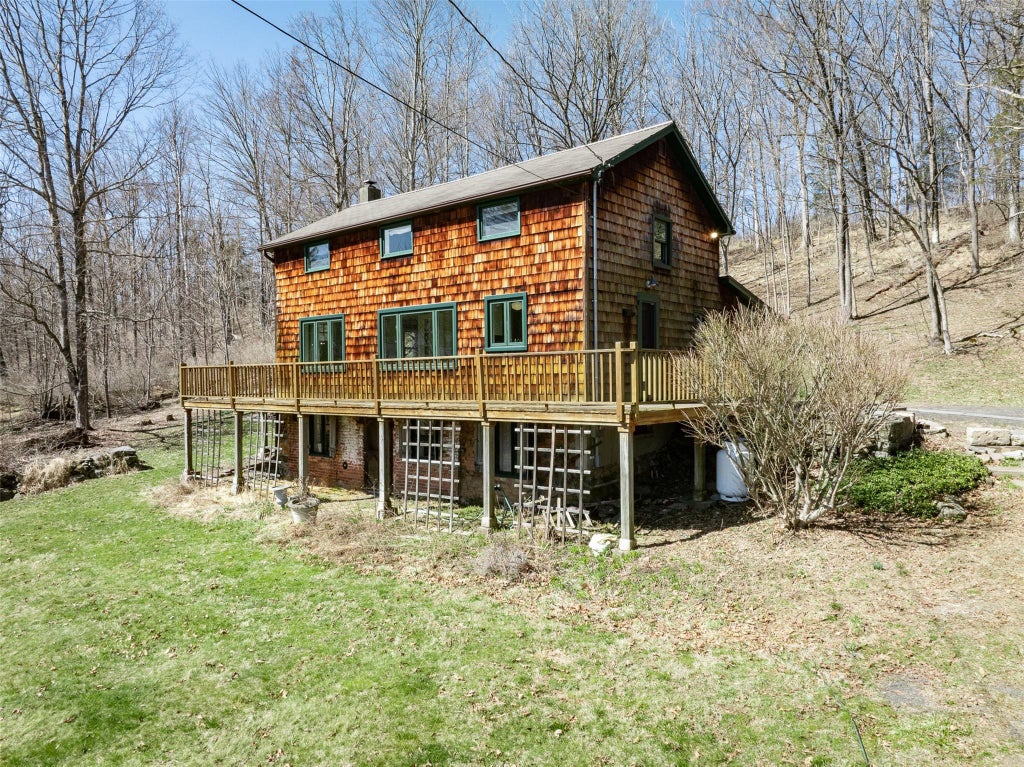 Rare opportunity to own a piece of history. Set on a knoll, with expansive vistas overlooking farmland and the distant mountains, 592 County Road 6 was originally built as a cooperage in 1840, now a charming country home with the rare mix of midcentury and vintage vibe. Updated kitchen and bathrooms mix seamlessly with the retro style of the home. Downstairs you will find a chef's kitchen, dining area, bath, living room with fireplace and an office/playroom/studio facing the hill. . Upstairs are two large bedrooms, bath and a linen closet. Every room offers a vantage point to the extensive scenic panoramas. Stone walkout, heated basement can serve as a creative space. Watch the eagles soar while enjoying your morning coffee on the extensive decking or stone patio. A pair of nesting bald eagles are in a massive tree across the road, overlooking the Rondout nearby. The shed was built in 2022 with storage shelving and enough room for a workbench and tools, and is fully insulated and can be used year-round. The shed is electrified with sufficient power to service an electric vehicle charging station. The hill behind and to the left of the house is predominantly black walnut and ash trees. The two large trees on the circular driveway are maple and oak. Rag Mama Rag song by The Band, was recorded in the house next door. Walk down the road to collect your veggies for dinner from the local CSA. Rondout river is close by for fishing, kayaking and canoeing. Cool off on a hot summer day in the Big Deep on the Peterskill Creek. When you feel like hiking or biking the Mohonk Preserve is just a 5-minute drive. Looking for a Country Home with endless charm, stop by to visit, you won't want to leave.