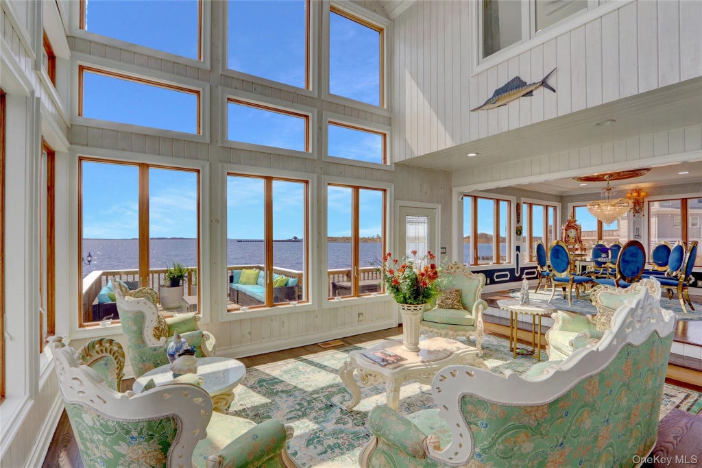 Waterfront Luxury meets architectural brilliance on the Great South Bay! This stunning 5-bedroom, 4935sq ft estate is a one-of-a-kind masterpiece featuring sleek design, panoramic water views, boat slip and 122ft of new bulkhead and docking for all your toys. With an expansive Rooftop Deck, wall to wall windows, Chef's kitchen and luxe en-suites set on its own private peninsula with nearly one acre of land, this is an exceptional property for boaters, fishing enthusiasts and anyone seeking a waterfront retreat! Inside, soaring walls of windows in the living room, family room and dining room frame breathtaking panoramic water views. A Sleek bar in the living/dining area adds a touch of refined indulgence for entertaining. The spacious chef's kitchen features a large center island with prep sink, Thermador appliances, including two full refrigerator freezers, a built in coffee bar, and sleek custom finishes. The home offers two primary suites and three additional guest rooms, each with private en suite bathrooms, ensuring comfort and privacy for all. Outdoor living is unparalleled, with expansive bayfront entertaining spaces and gravel hardscaping, a rooftop terrace, and multiple lounge areas overlooking the water. Perfect for enjoying sunrises, sunsets, and even local fireworks!