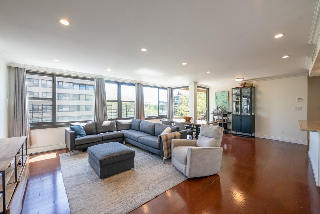 This fully renovated 2-bedroom, 1-bathroom apartment features a zoned central HVAC system with supplemental heating, a modern open-concept kitchen with stainless steel appliances, quartz countertops, and a filtered water/instant hot dispenser. The updated bathroom includes a deep soaking tub, rain shower, and custom vanity. Hardwood floors, recessed lighting, crown molding, custom Elfa closets, and prewiring for power shades and wall-mounted TVs add convenience. Enjoy water and bridge views from the balcony, located across from tennis courts, a pool, and a fitness center. Includes a dedicated parking spot just outside the building. Call or text listing agent for more information.