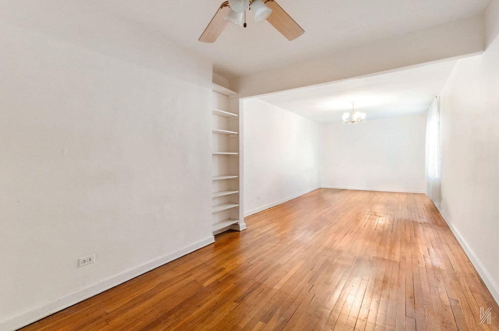 This one-bedroom unit is in a quiet area of Jackson Heights. Upon entry, you’ll notice hardwood floors and natural sunlight from south-facing windows. To the left is a dining area that can easily seat a table for four and is completed by the stylish ceiling fan above. Beyond that is the generously sized living room that includes a built-in bookshelf. The space is perfect for various furniture layout options, such as a large sectional sofa or carving out space for a home office. The windowed kitchen has white cabinetry that extends to the ceiling, providing ample storage space. Additionally, there is counter space on either side of the sink, perfect for food preparation. For added privacy, a hallway separates the living area from the bedroom and bathroom. The bedroom has two windows, a huge closet, and an additional linen closet outside. There are a total of three closets, all of which are double-wide. The windowed bathroom boasts a glass-enclosed tub/shower combo and a pedestal sink. The co-op is well-maintained, with a monthly maintenance fee of $768.44 that covers electricity, gas, taxes, heat, and hot water. Southridge Section One has excellent financial statements and offers several amenities, such as a gym, playroom, party room, lounge/library, indoor bike rack, and 24-hour laundry facilities. An attentive staff of six is available on the premises for 24/7 emergencies. The property features four beautifully maintained courtyards and gardens, and there is a waitlist for parking and storage. A 20% down payment is required, along with board approval. While subletting is not permitted, small pets and dogs are welcome. Restaurants, shopping, parks, and cafes are conveniently located just moments away.