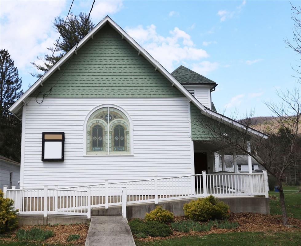 Bring your creativity to this classic church in Hankins and give it a new purpose. The building is in very good shape, with a sound structure, beautiful woodwork and soaring spaces. It's perfect for an open-concept renovation. The main congregation room measures 29' x 23' and is suffused with soft light from the stained-glass windows. There's a kitchen and a half bath, as well as a 35'x 16' dining/gathering area. Rich wainscoting, window trim, chandeliers, and built-ins add a warm feel. Oil-fired warm-air heat, on-demand hot water, architectural shingled roof, high-speed cable on the street. The large back yard provides room for croquet, badminton, or other outdoor fun. And you can always ring your own bell! Close to the restaurants, shops and farmers market in Callicoon and the Delaware River. 2 hours NYC. Taxes reflect current exemption; post-sale taxes TBD. Additional Information: HeatingFuel:Oil Above Ground