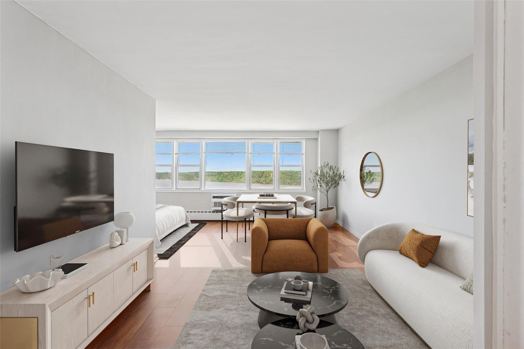 High-Floor Studio with Stunning Manhattan Skyline & River Views! Elevate your lifestyle with this high-floor studio in a full-service luxury high-rise. Expansive, unobstructed views of the Manhattan skyline, George Washington Bridge and Hudson river right from your home! South facing windows bathe the space in natural light, creating a bright and welcoming atmosphere from sunrise to sunset. The open-concept layout provides a versatile canvas, and with recently installed flooring , the potential is undeniable. Whether you're looking to customize your perfect city retreat or invest in a space with spectacular views, this unit delivers on both. Enjoy top-tier building amenities including a 24-hour concierge, fitness center, seasonal pool, tennis court, gazebo lounging area, and more—all just minutes from world-class dining, shopping, and convenient transit options. Residents enjoy: Electric car charging station, private dog park, private playground, parking options, and more. Pet-friendly: 1 dog, 2 cats permitted. 20% down and board approval required. Skyline views. River serenity. Unlimited potential. Schedule your private tour today.