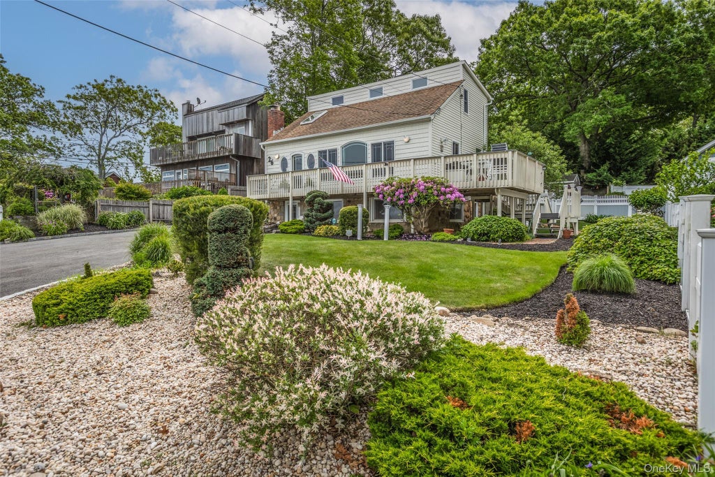 Enjoy unobstructed panoramic water views from this updated home which includes a legal two-bedroom accessory apartment. Located on a quiet street high above Long Island Sound, the home has a wraparound deck with views from several angles. There is also a private rear yard providing space for outdoor dining and entertaining. The light-filled interior features all Andersen windows, a living room with custom cathedral ceiling, updated eat-in kitchen with brand-new stainless steel appliances and quartz counters. Also on this level is a guest bedroom/office and full bath with jetted tub. Stairs leading to the balcony and primary bedroom have wainscoting on the walls. The primary bedroom features water views, a skylight, and an updated bath with designer touches and a new shower. Also on this level is a walk-in closet that was originally a bedroom with a window and additional storage space. On the first level is the accessory apartment, which features a separate entrance, a living room, a galley kitchen, a full bathroom, and two bedrooms. Among the updates are brand new hot water heater (2025), new siding (2024), heating system (2023), roof (2017), and weather-sealed stormproof Andersen windows. Minutes away is a private North Shore Beach which completes your perfect weekend retreat or year-round home. Your opportunity to experience coastal living!