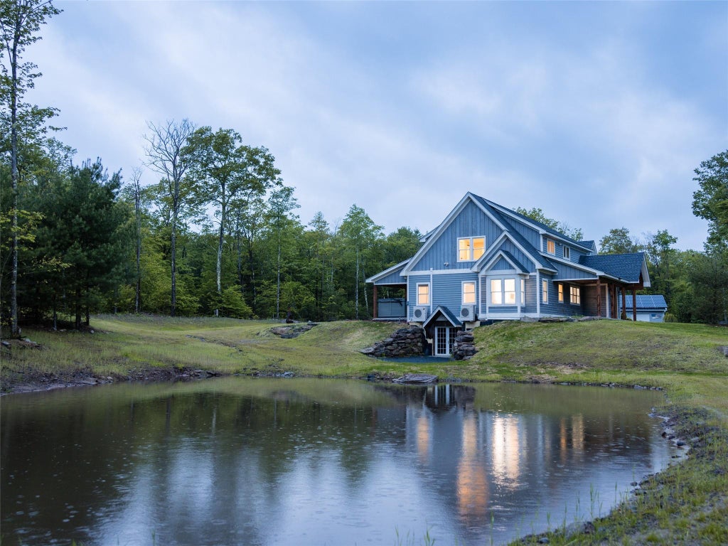 Nestled in the heart of Forestburgh, in the Foothills of the Catskills, this recently completed, stunning 5-bedroom, 4.5-bathroom Contemporary Farmhouse sits on 5 picturesque acres, offering a blend of modern elegance and rustic charm. A grand foyer with double entry doors welcomes you into the open floor plan, where oversized windows flood the space with natural light. The spacious living area features engineered wood floors, a cozy fireplace with a pellet stove insert, and built-in bench seating with storage. The chef’s kitchen is thoughtfully designed with an expansive island, stainless steel appliances, a six-burner propane stove with griddle, and a large butler’s pantry with a pocket door for additional storage and prep space. The main-level master suite boasts French doors, a luxurious ensuite bath with double vanities, a walk-in shower, a soaking tub, radiant heated floors, and an expansive walk-in closet complete with a washer and dryer. The second floor, completed this year, adds additional bedrooms, baths, and living spaces, making this home perfect for families or entertaining guests. Step outside to enjoy the covered patio with a hot tub and outdoor kitchen potential or take in the scenic beauty of the newly added pond and surrounding forests.