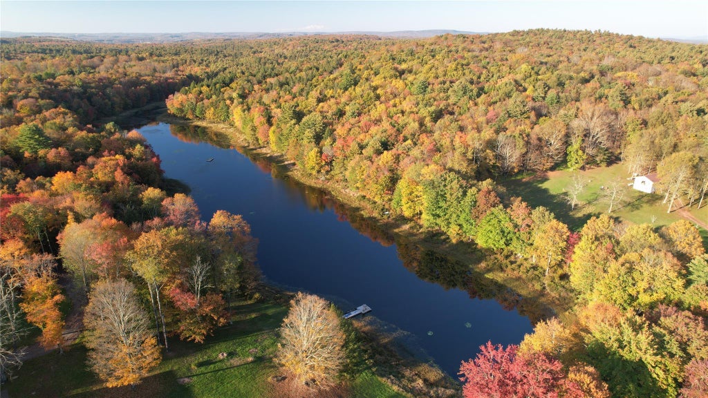 The lot is situated on both sides of John Bishop Road. One side features most of Bishops Pond, a peaceful and serene, 10-acre lake with a waterfall. There is a luxurious lakefront 960sf container house with three bedrooms and two bathrooms that was previously operated as a five-star rental on Airbnb. The house features four ductless mini splits and an electric fireplace. The spacious kitchen has stainless steel appliances, quartz countertops, and ceramic tile backsplash. The tiled bathrooms offer showers with natural riverstone and slate, as well as rainfall showerheads. There is an additional container house that will need to be completed, as well as a third foundation ready for a house. All three sites are connected to a 9-bathroom certified septic system and get water from an on-site well. Besides these three sites that sit on a large clearing, there are acres of woods with potential for development, on both sides of the lake. The other side of the lake is completely raw land, a pristine forest teeming with flora and fauna.