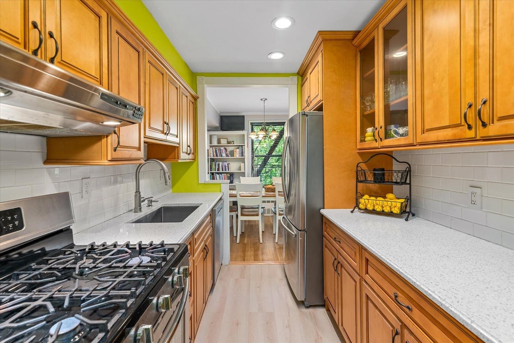 This spacious one-bedroom L-shaped co-op offers a flexible layout with a designated dining area that can easily be converted into a second room, home office, or guest space. The long living room provides plenty of room for both relaxing and creating a work or exercise area. The kitchen has been updated with quartz countertops and stainless steel appliances, and the bathroom features ceramic wall tiles, marble flooring, and a soaking tub with a built-in seat. Beautiful wood floors run throughout the apartment, which gets great natural light and offers an open view of surrounding trees. The oversized bedroom (approx. 11'1" x 16'8") fits large furniture comfortably, and there are four deep closets for excellent storage. Monthly maintenance is $873.02 and includes heat, hot water, cooking gas, and real estate taxes. (Breakdown: base $749.70, security $20.00, insurance $103.32.) There's also a low flip tax of just $5.00 per share. Conveniently located near the Lindenwood Shopping Center, express and local buses, and major expressways.