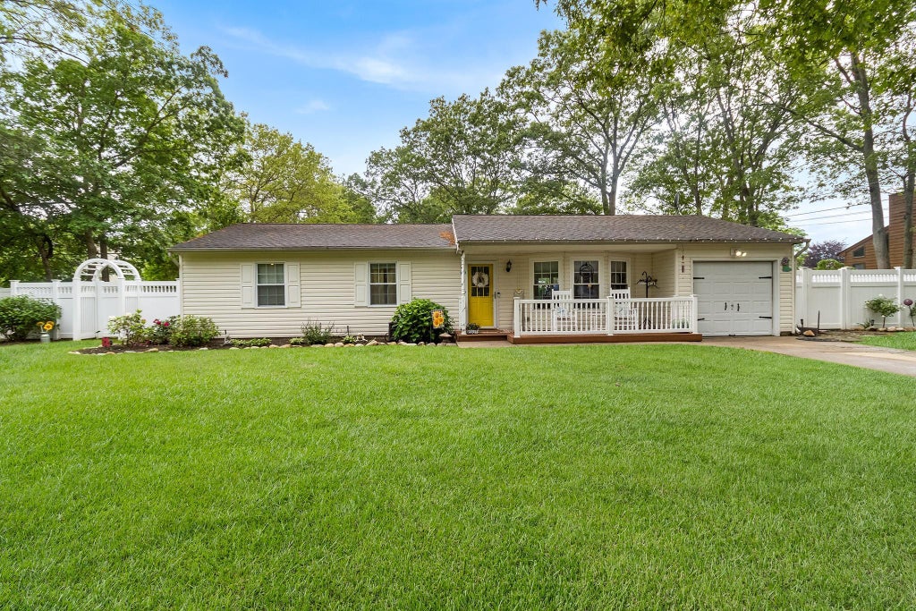 Welcome to 44 Lowell Ave in Holtsville—this charming ranch offers impressive curb appeal with vinyl siding, manicured landscaping, and a long driveway for multiple vehicles. Enter inside to a bright, open-concept living room with soaring cathedral ceilings, perfect for everyday living and entertaining. The eat-in kitchen features ample cabinetry and counter space. All three bedrooms are generously sized, and the full bathroom is centrally located for convenience. The attic, easily accessible via the hallway, includes plywood flooring for excellent storage. Out back, enjoy summer fun with a spacious vinyl deck, complete with a propane firepit, glass table and chairs, and dual umbrellas. The above-ground pool and jungle gym/playset make the backyard a true retreat. Located near parks, shopping, and dining, this move-in ready home blends comfort and convenience. Don’t miss your opportunity to enjoy suburban living with easy access to major roads and nearby communities!