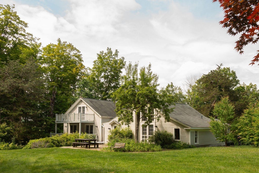 Tucked away on a quiet country road, this peaceful farmhouse sits on fifteen acres of native gardens, expansive lawns, wildflower meadows, blue stone patio and porches, and private forest with trails leading to the second spring-fed pond. Enter the house through an airy mudroom, then the Great Room lays out before you. The patio and pond draw you to the far end of the room, where French doors let you out to this idyllic space. The vaulted ceiling, wood-burning stove & exposed beams add to the charm. The open kitchen was designed by a chef, with soapstone counters, a center cooking island, classic cabinetry, and multi-use oven and stove. The farmhouse sink connects the kitchen to the light-filled dining room, giving the first floor a loft-like feeling and flow.