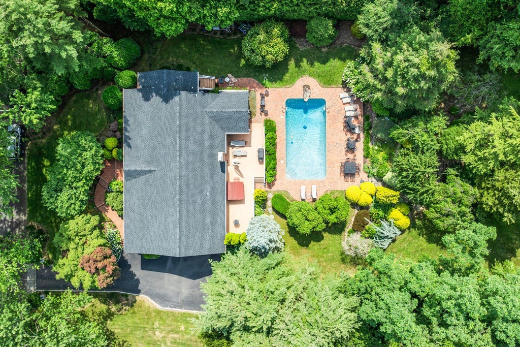 Sprawling Ranch set on a beautifully landscaped acre in Dix Hills, located within the sought-after Half Hollow Hills School District. Nestled on a quiet street with underground utilities, the home welcomes you with mature specimen plantings and a covered front entry. Inside, the foyer with coat closet opens to a stunning great room featuring vaulted ceilings, gleaming hardwood floors, and a stone fireplace. The adjoining eat-in kitchen boasts granite countertops, stainless steel appliances, and a sun-drenched breakfast nook surrounded by windows. Entertain in the formal dining room or unwind in the spacious media room. The expansive primary suite impresses with soaring ceilings, a spa-like bath with a soaking tub, and sliding glass doors leading to the backyard. Step outside into a true backyard oasis—surrounded by lush flower gardens and mature trees for added privacy. Featuring a gunite pool with brick patio, and an upper-level lawn with basketball court. A two-car garage offers direct access to a full basement, providing abundant storage and the potential for additional living space. Tucked away yet minutes to shopping, dining, and major roadways, this home offers the perfect blend of serenity and convenience.