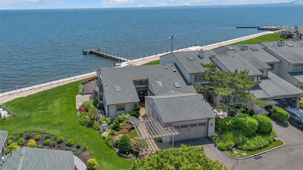 Exceptional Bayfront corner Constellation model unit in Captain’s Walk offering unobstructed, panoramic views of the Great South Bay from nearly every room. This 3 BR, 3.5 fully renovated townhome showcases sweeping water vistas, with breathtaking sunrises and sunsets. Step inside a stunning two-story entry foyer with soaring ceilings, a floating staircase, and an open-concept living and dining area anchored by a dual-sided gas fireplace. Walls of glass sliders open to beautifully landscaped gardens, seamlessly blending indoor and outdoor living. The sleek, contemporary kitchen is fully updated with custom cabinetry, premium Wolf and Sub-Zero appliances, and quartz countertops. The palatial primary suite overlooks the bay and features a luxurious spa-inspired bath with modern finishes and a spacious walk-in closet. A second bedroom on the main level offers its own ensuite bath, while the second floor features a lofted third bedroom/flexible living space, a private balcony with expansive water views and a full bathroom. No detail has been overlooked—every system has been thoughtfully upgraded, including radiant heat flooring, high-efficiency HVAC, central AC, 200-Amp Electric, and much more. This rare and highly desirable corner residence presents a remarkable opportunity to enjoy refined coastal living in one of the South Shore’s most peaceful waterfront communities.