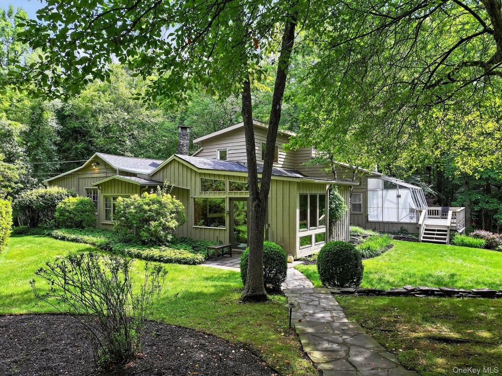 A half mile from the center of Woodstock, a bucolic 3.7-acre compound offers a rare blend of architectural charm, natural beauty, and versatile living. Property includes the main house and two outbuildings, a one-bedroom cottage and a studio with an attached three-bay garage. Bedroom and bath layout described as the primary residence having three bedrooms and three full baths measuring 2200 sq. ft. The detached cottage has one bedroom with one full bath measuring 480 sq.ft and the detached studio has another full bath measuring 400 sq ft. Main house is a light-filled classic Woodstock modern home built around the original Woodstock's artist's cabin. Thoughtfully designed to frame the surrounding forest through expansive glass sightlines, allowing for views of deer, birds, and other wildlife throughout the seasons. Inside, the home showcases unique historical details such as chestnut beams in the dining room, a bluestone fireplace, a built-in library, and a mix of slate, Spanish tile, pine, and oak flooring. Multi-level living area features a lofted tongue-and-groove wood ceiling and five architectural skylights that bring the outdoors in. Upon entry, you're greeted by a bright and inviting sunroom that opens into a formal foyer. Off the foyer is a room that can serve as a home office, reading nook, or playroom, conveniently located next to a full guest bathroom. Also features a cozy bedroom and a hallway office nook—perfect for remote work or quiet study. Eat-in kitchen includes a charming breakfast nook that offers serene views of the surrounding landscape and seamlessly flows into the dining room, creating a warm and inviting connection between the spaces. Dining area doubles as a music room, enhanced by vintage wide-plank pine flooring and a wood-burning fireplace that adds warmth and character. Step down into the sunken living room, where high ceilings and built-in bookshelves create a bright, welcoming space ideal for relaxing or entertaining. Primary suite features an en-suite bathroom with Parisian influences, including a bidet and a deep, one-person soaking tub with jacuzzi jets. Sliders walk out to the private multi-level deck and your own private atrium. Just off the main area, a newly designed mason-laid bluestone patio features a seamless transition into an expansive deck, offering the perfect setting for quiet evenings or vibrant dinner parties. The second floor features a loft area, providing a comfortable space to relax or entertain. Tucked away for privacy, the second primary suite includes a full bath, creating a serene retreat separate from the main living areas. The one-bedroom cottage evokes the feel of an English guesthouse, with wood floors, a full kitchen and bathroom, and its own dedicated utilities, making it a wonderful space for guests or potential rental income. Detached studio, adjoining the three-car garage, feels like a New York City loft, complete with wide-plank floors, an open-concept layout, a bathroom, and a kitchenette. With its own electric and utilities, the space lends itself well to use as an office, yoga or art studio, or another income-producing rental. The garage offers three bays—two for vehicles and one ideal for workshop or storage use. The home is designed to inspire and connect. It's an exceptional retreat with comfort, character, and potential in every direction. Improvements throughout the property include; new roofs on the main house, all new skylights, a new boiler and hot water heater (2024), upgraded 200-amp service, newly stained deck, new handrails, replaced garage door springs, & new storm doors on both the cottage & studio. Additional upgrades: redone entrance with new windows, a riser added to the septic system, and reworked bluestone patio by the cottage. A beautiful new bluestone patio was also added for the main house, providing more outdoor space. ** Accepted offer 10/10/25 **