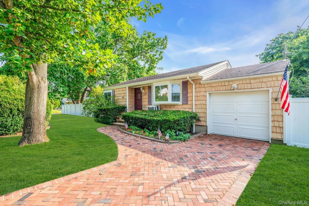 This delightful ranch with a cozy atmosphere is located on a 1/4-acre corner lot. The home features three comfortable bedrooms and a newly updated full bathroom. Wood floors extend throughout, with additional hardwood preserved beneath the carpeting. The home is equipped with efficient gas utilities, including a gas burner, hot water heater, range and dryer. The full, finished basement provides a spacious open playroom complete with a wet bar and room for a home office. An ideal setting for entertaining or to work from home. Step outside, you'll find a generous backyard designed for both relaxation and gatherings. Whether enjoying the fire pit or taking a dip in the above ground pool, this space is perfect for creating lasting memories with family and friends. An attached one-car garage and an in-ground sprinkler system add to the home's convenience. The location is exceptional, with Smith Haven Mall nearby for shopping, as well as fine dining, major highways, and the Long Island Railroad all within easy reach. This property is truly a gem and a wonderful opportunity for someone looking for a starter home or to downsize into something more comfortable. Easy to show!