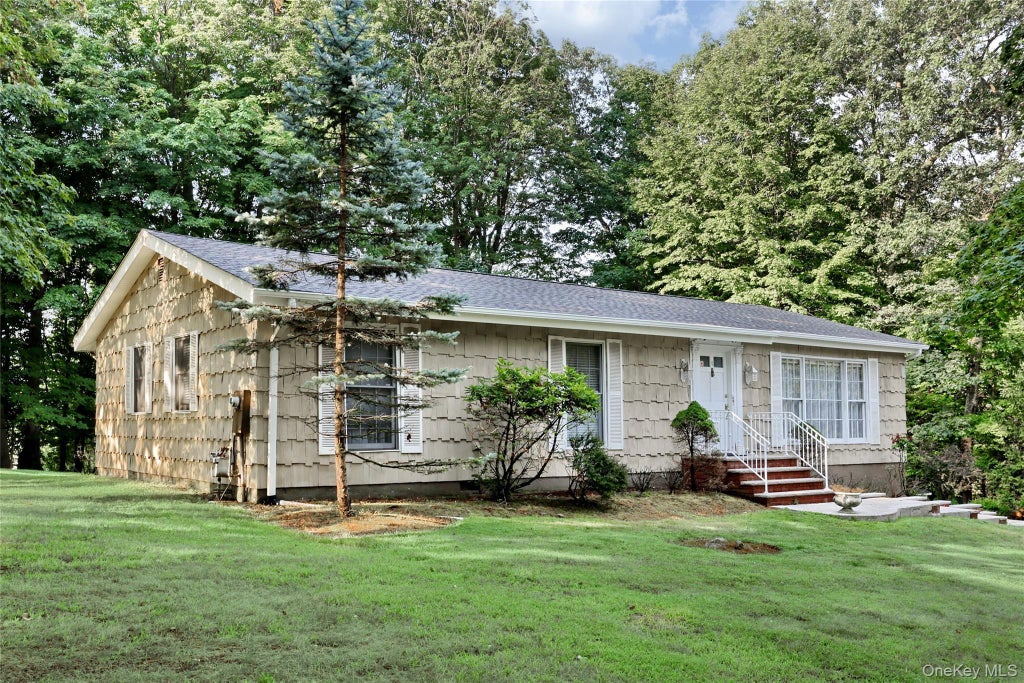 Chestnut Ridge! Lovingly maintained 3-bedroom “L”-shaped ranch set on a private property! Step into the welcoming foyer and enjoy the updated wood kitchen with abundant cabinetry. The formal dining room, with hardwood floors and plenty of table space, flows seamlessly into the family room featuring a charming brick fireplace. Three spacious bedrooms and two full baths complete the main level. Additional highlights include a 2-car garage with a workshop on the lower level, detached shed for storage, and a beautiful property offering peace and privacy. New roof and soffits.