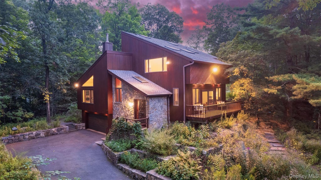 Modern convenience meets the tranquility of nature in this mid-century inspired retreat. Set on 1.04 acres, this 3,160 SF contemporary home blends privacy, clean lines, and seamless indoor-outdoor living. Expansive Marvin windows, vaulted ceilings with skylights, exposed beams, and a sunken living room connect every space to the outdoors. Multiple decks invite you to read, bird watch, or simply soak in the serene landscape. The chef’s kitchen with granite waterfall island, mahogany counters, stainless Thermador appliances, and double ovens flows to the dining room and large slate patio overlooking meadows, rock walls, and mature trees. Hardwood floors, mahogany siding and a wood-burning stove add warmth and character. Upstairs offers three bedrooms including a primary suite with private bath and balcony, plus a large bonus room, laundry, and a full walk-up attic with potential for expansion. Lush pollinator gardens, lower lawn, and versatile outbuildings - garden sheds, and storage - enhance a sustainable lifestyle. Additional highlights include an ADT alarm/fire system, generator hook-up, plenty of storage and a two-car garage. Minutes from town, highways, and a 30-minute train to Grand Central, this property offers modern living in harmony with nature.