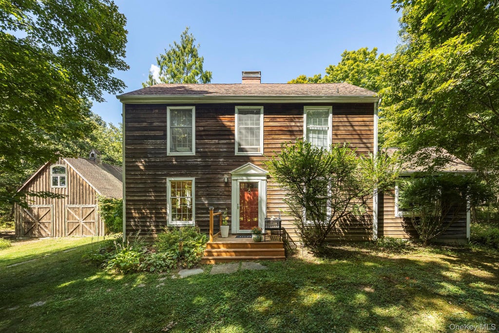 Welcome to this enchanting Cedar-Clad Dresden Saltbox home, designed by McKee Wing Roth Jr. Nestled on 7.56 acres along quiet and desirable Mountain View Road in Rhinebeck, NY, this home is surrounded by nature and offers a peaceful country lifestyle. Inside, a light-filled kitchen opens seamlessly to the beamed ceilings of dining and living area, where a beautiful fireplace serves as the centerpiece in the house . With 2 sets of glass doors that lead out to a spacious back deck, perfect for soaking in the lush greenery and tranquil surroundings. The first-floor den/office is generous in size and includes a half bath and laundry area—flexible enough to serve as a primary bedroom if desired. Upstairs, you’ll find two additional well-sized bedrooms and a full bath, along with ample storage throughout. A crawl space basement houses the mechanicals. Adding to the property’s appeal is a two-car barn/garage with loft space, built in 2000 to complement the home’s charm. With its outside access, the loft could easily be transformed into a studio or creative workspace. The grounds feature flowering shrubs, winding vines, and even an extraordinary redwood tree, creating a truly special and inviting setting for any purpose. ** 24 hours notice to show ***