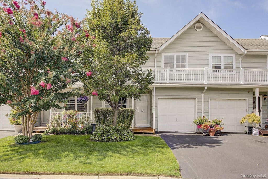 Welcome to this lovely townhouse condominium, which offers a perfect blend of comfort and functional living. The first floor features an open-concept living and dining area with soaring cathedral ceilings providing lots of natural light. The space flows seamlessly with a beautiful kitchen, sliding doors to the rear deck, new laminate floors, a 1/2 bathroom, and access to the full basement. Open stairs lead to the second floor, which features two spacious bedrooms, a full bathroom, and lots of storage, including large closets in the master bedroom. The townhouse includes a large basement, providing ample space for storage, or it can be finished for additional living space. A one-car garage, private driveway, and front porch complete this lovely townhouse in a relaxing community that offers a clubhouse, tennis courts, pools, and easy access to shopping, parkways, and LIE.