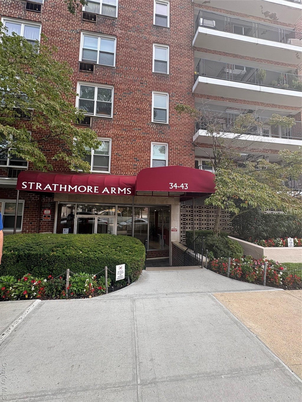 Centrally located building in the heart of Woodside. Strathmore Arms has easy access to BQE, # 7 train, LIRR, R and M Subway line. Quiet street and in Walking distance to restaurants and shopping. Apartment is a large 1 bedroom with Eat-In kitchen and a balcony. Ready to move in with hardwood flooring throughout, closet space and updated kitchen. Building has a nice courtyard, laundryroom, bike and package rooms, elevator and a parking garage. Parking has a waitlist. There is a live in super - dont miss out!