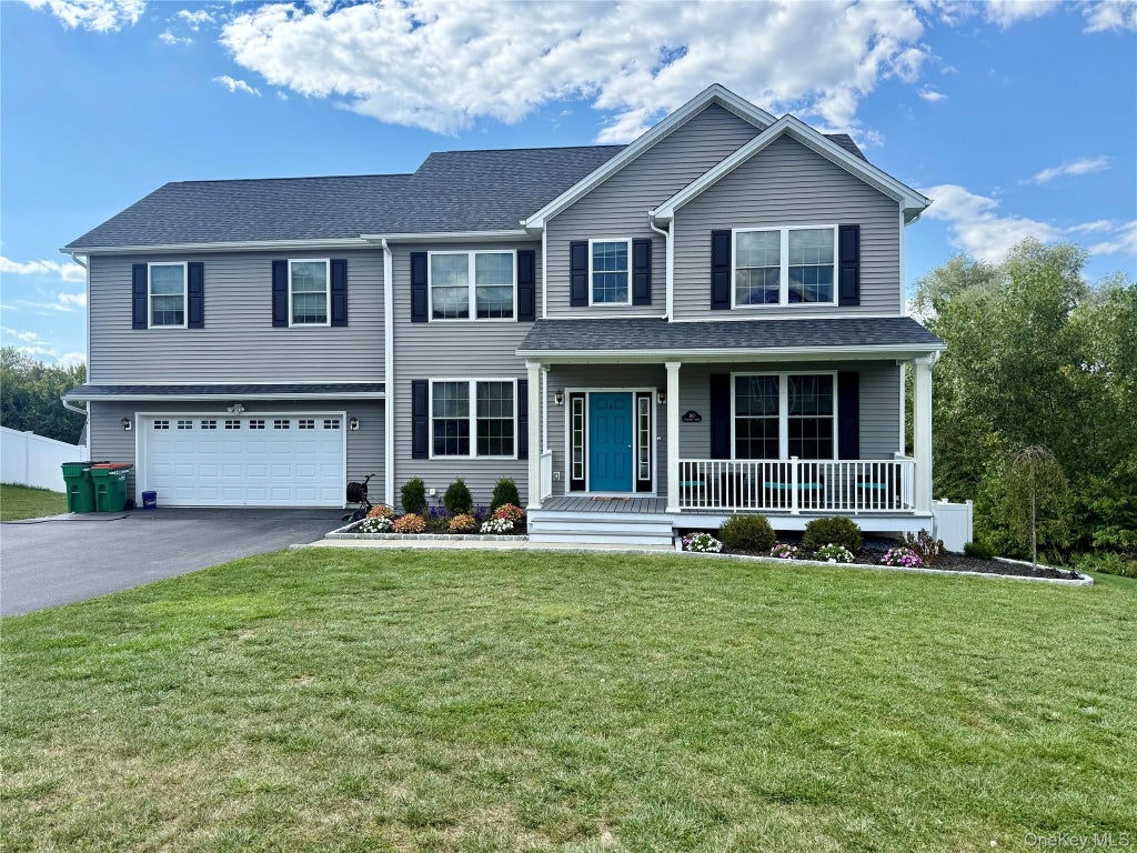 Welcome to the sought-after Stratford Farms development within the Arlington School District. This stunning Essex Model colonial set on .45 acres offers 4 bedrooms, 2.5 baths, a 2-car garage, and 2,689 sq. ft. of living space, including a partially finished 1,192 sq. ft. basement. Built in 2018 with seller-added upgrades, the home features a welcoming front porch and entry foyer leading to an open-concept layout with family room/office. living room with cathedral ceilings and oversized dual-level windows, gas fireplace, formal dining room and main level half bath. The modern kitchen is equipped with a large center island, granite countertops with a durable leather finish and stainless-steel appliances (refrigerator, gas stove, microwave, dishwasher). Glass sliding doors off the kitchen walk out to a 16x20 wooden deck. There is convenient access from garage to the kitchen, hardwood floors span the main level and second-floor landing, while bedrooms are carpeted for comfort, with the upstairs landing overlooking the living room; the master suite boasts a walk-in closet with sliding barn door and a spa-like ensuite with double sinks, granite counters, and an oversized shower. The second floor also includes ad additional full bath with tub/shower combo and three spacious bedrooms with ample closet space including a walk-in, second floor dedicated laundry room with utility sink, linen closet and pull-down stairs to an unfinished attic. Upgrades include custom blackout blinds throughout, recessed lighting, central air, an Energy Star Navien hydronic boiler (2018), a main -level oversized deck with stairs to a stone patio, fenced backyard with new retaining wall, 21-ft saltwater above-ground pool, outdoor oasis with privacy and great space for entertaining. House is hardwired for alarm system with full property radius cameras, carbon/smoke detectors. This home has been meticulously maintained to look brand new! The location offers convenient commuter travel only minutes from the Taconic Parkway, Route 44, Metro-North Poughkeepsie Station and bus line, schools, restaurants, shopping, Eastdale Village, Marist and Vassar Colleges, the Culinary Institute, Route 9 shopping, and for natures tranquility, two nearby rail trails and the Walkway Over the Hudson. Start your next chapter in a home that blends comfort, style, and convenience—reach out today to schedule your showing! Preapproval or Proof of funds required, 24-hour notice preferred. - MOTIVATED SELLER- PRICE REDUCED TO SELL!