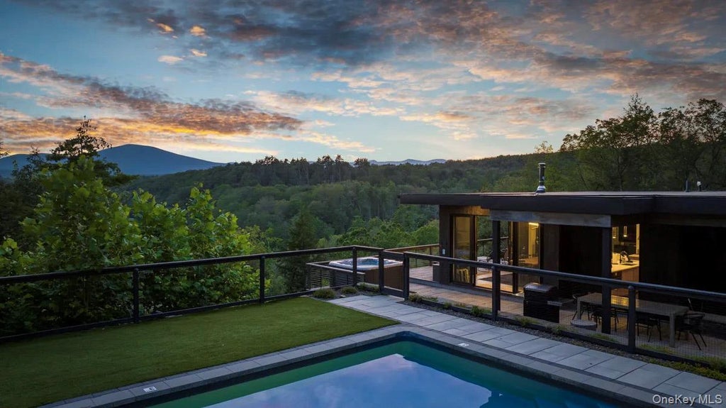 Outdoors, the home transforms into a retreat for every season. A heated pool invites summer afternoons, while a hot tub, fire pit, and multiple dining and seating areas set the stage for gatherings under the stars. From morning coffee on a quiet deck to evening sunsets over the Catskills, every corner offers a place to pause and take in the setting.