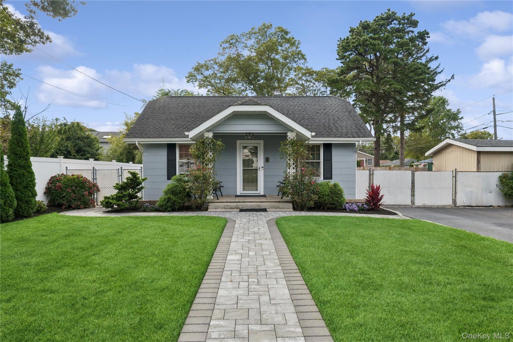 This charming ranch sits on an oversized 100x100 corner property and is move-in ready with great updates throughout. The home offers 2 bedrooms and 1 full bath, with an updated kitchen featuring granite counters, stainless steel appliances, ample cabinetry, and an eat-in area with a Pella slider leading out to the backyard. The updated bath includes a steam shower, and the living room provides comfortable space for a large sectional, highlighted by cherry wood hardwood floors. Freshly painted inside and out, this home also features newer windows, a newer roof, a brand-new oil tank, inground sprinklers in the front yard, and a fully fenced property. A full walk-up attic provides excellent storage, while the basement includes laundry and additional space. Approved plans for an extension are in place, giving you the option to expand in the future. Lovingly cared for and well maintained, this home offers beautiful curb appeal, an expansive lawn, low taxes, and a convenient Holbrook location — a wonderful place to call home.
