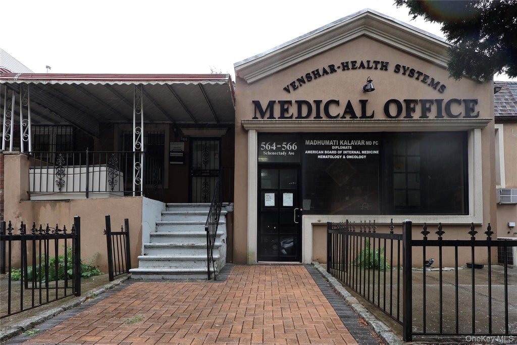 Welcome to 566 Schenectady Avenue, a unique investment opportunity in the heart of East Flatbush, Brooklyn. This combined parcel (564 & 566), two properties, has been seamlessly merged into a single, expansive lot with R6 zoning, allowing for flexible residential or mixed-use development up to 4 stories under the current zoning code. Features include a private elevator (3 zones), basement leading to rear exclusive parking, and wide frontage for visibility. Currently operating as a fully equipped medical office, this commercial building is ideally located directly across from a major hospital, making it a turnkey solution for healthcare professionals or investors targeting healthcare, residential, or community facility tenants. This property presents a rare blend of existing income potential, development flexibility, and a strategic location in a high demand medical corridor. Whether you're a developer, investor, medical professional, or someone seeking a commercial property, this commercial asset is an opportunity you won't want to miss.