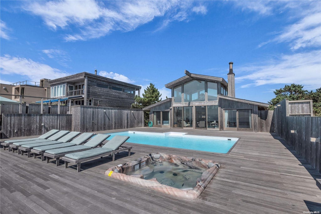 Welcome to 146 Ocean Walk, an inviting oceanfront sanctuary gracefully positioned in the heart of Fire Island Pines, NY. This special home is highlighted by a striking 17-foot glass wall that effortlessly frames expansive ocean views, along with one of the area’s largest oceanfront decks—perfect for peaceful mornings and star-filled evenings. Enjoy luxurious outdoor relaxation with the newly installed heated saltwater pool and hot tub. Designed for comfort in every season, this fully winterized retreat features central heating, air conditioning, and a cozy fireplace. Inside, three restful bedrooms and two comfortable bathrooms offer spaces thoughtfully arranged for easeful living. The kitchen, complete with quality appliances including a Sub-Zero refrigerator, ensures enjoyable gatherings and daily joy. Crafted to harmonize beautifully with its natural surroundings, this cedar-framed home offers tranquility, privacy, and the gentle invitation of effortless coastal living. Co-exclusive.